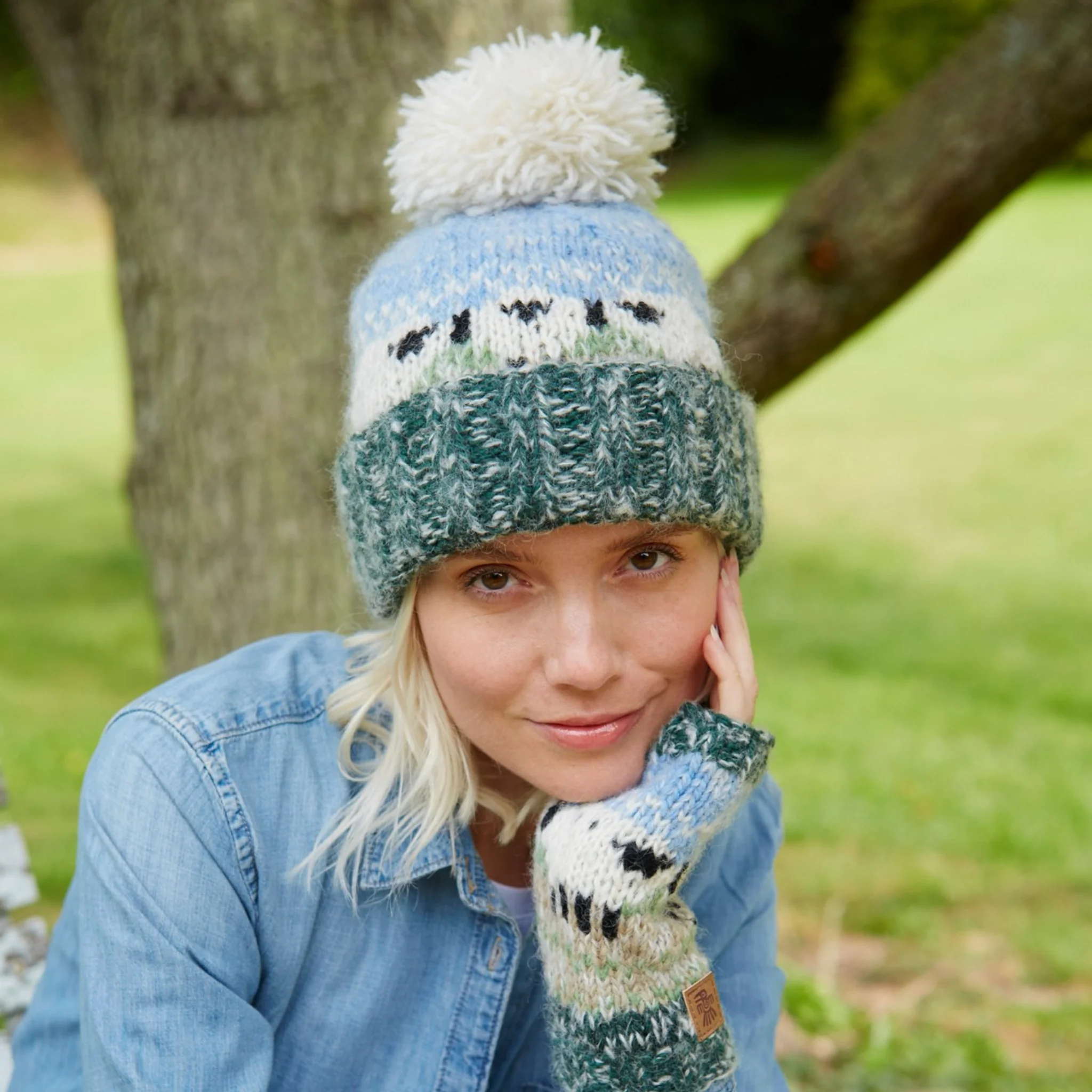 Women's hand knitted wool mohair blend and sherpa fleece lined bobble hat, with farm animal sheep patterns, fair trade and handmade in Nepal.